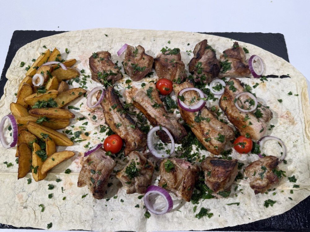 Шея 400 г, ребра 400 г, окорок 400 г, картофель по деревенски 300 г, лаваш, зелень, лук 150 г