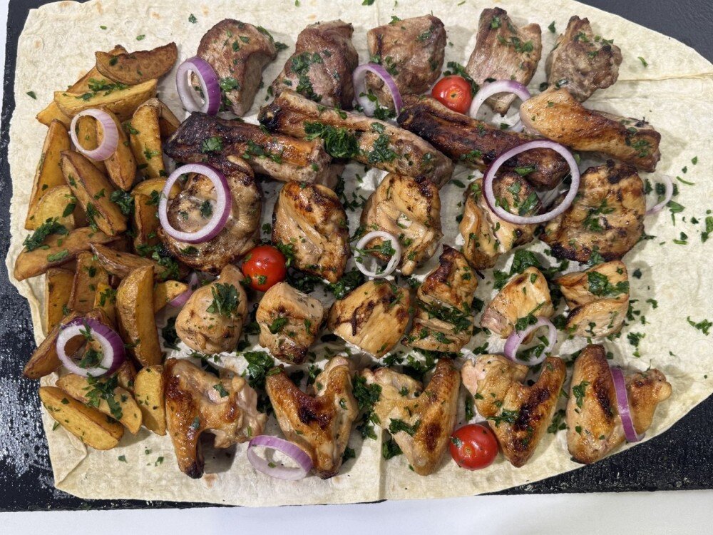 Шея свиная 500 г, ребра 500 г, филе куриное 500 г, бедро куриное 500 г, крыло куриное 500 г, картофель 500 г, лаваш, зелень лук 250гр