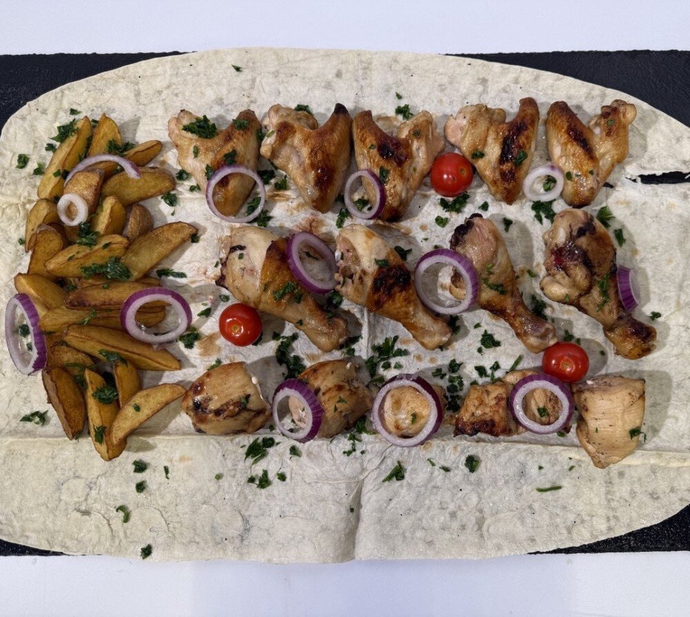 Филе 400 г, крыло 400 г, ножки 400 г, картофель 300 г, лаваш, зелень, лук 150 г